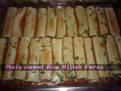9- يتم دهن الصينية بالقليل من الزيت، ثم يتم حشو الأنابيب بخليط السبانخ واللحم والباشاميل باستخدام ملعقة صغيرة وذلك بإقفال إحدى طرفي أنبوب المعكرونة بإحدى اليدين، وتُرتَّب بالصينية.